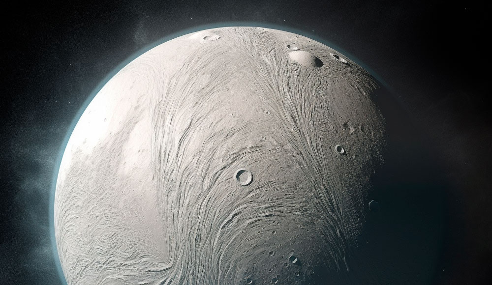 Jatos de vapor d’água em Encélado, que expeliram compostos orgânicos complexos no espaço. Crédito: Spacebetween